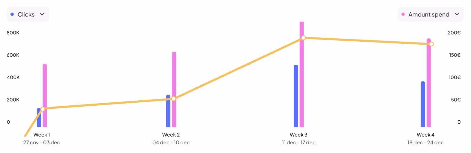 Yes. You can create custom metrics and formulas, apply complex filters, and choose your attribution window (1d, 7d, 28d…) — giving you complete analytical flexibility.