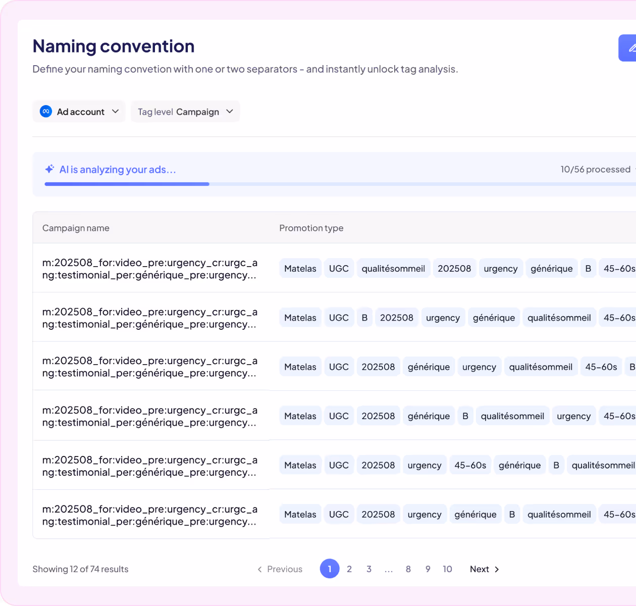 Naming Convention lets you define your own ad naming structure — from simple to advanced — and automatically extract every tag from your campaigns, ad sets, and ads to unlock deeper performance analysis.