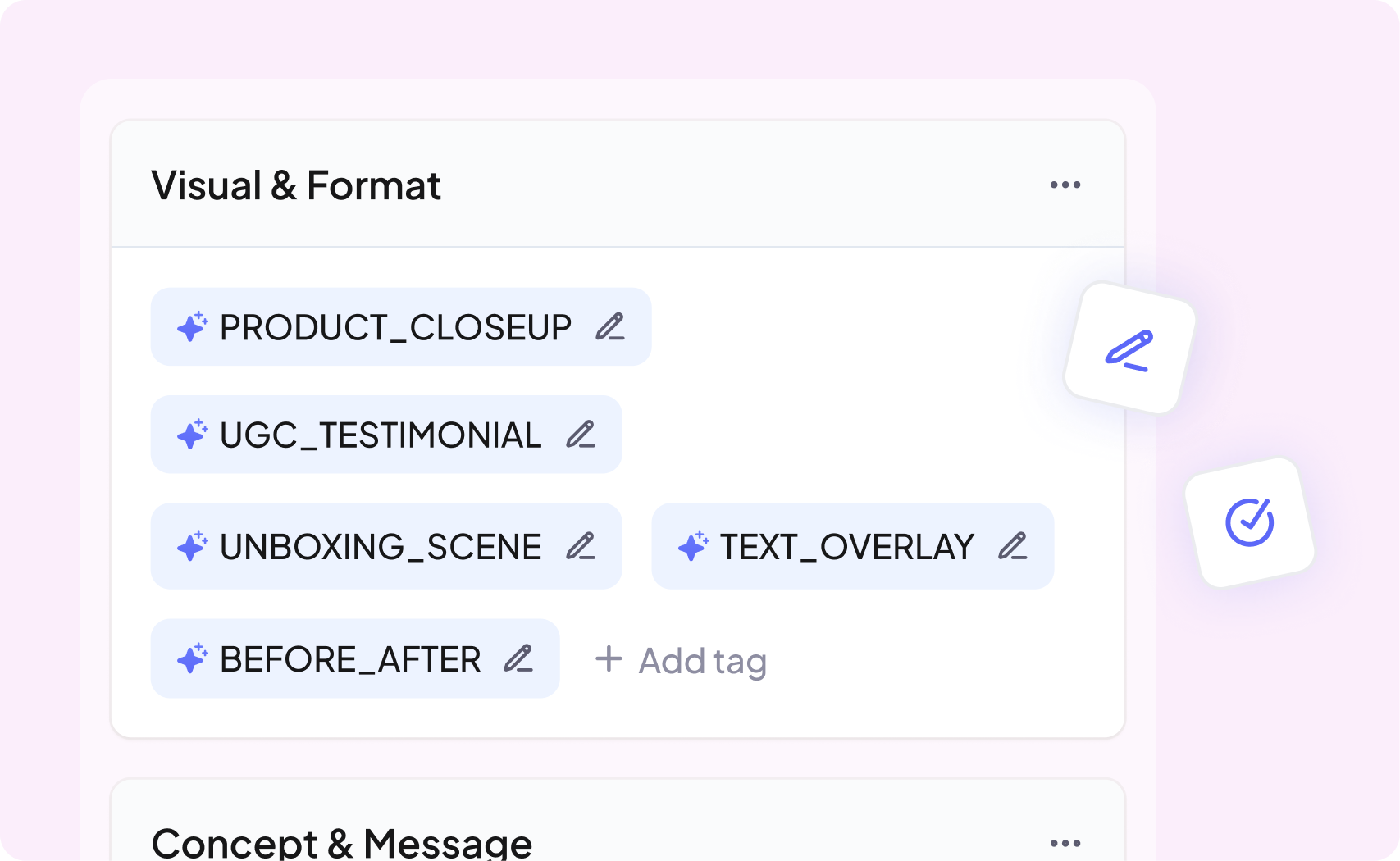 Define your own tag groups (e.g. “Format”, “Product focus”, “Human presence”) and let AI classify your creatives according to your structure and vocabulary.