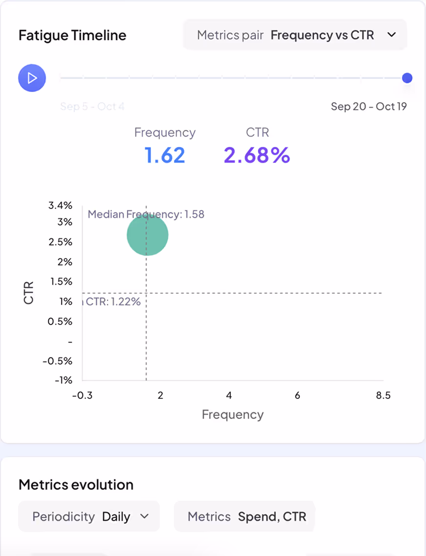 Visualize the evolution of each creative’s fatigue over time and instantly see when engagement or efficiency starts to fade.