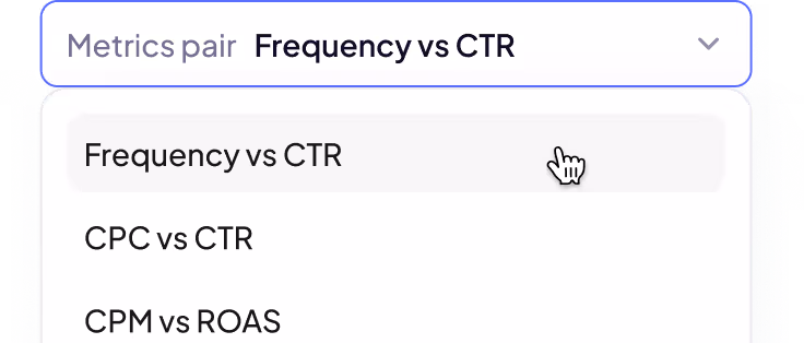 Choose the metric pair that best fits your analysis — like Spend × ROAS or CTR × Frequency — to spot early signs of fatigue under different performance angles.