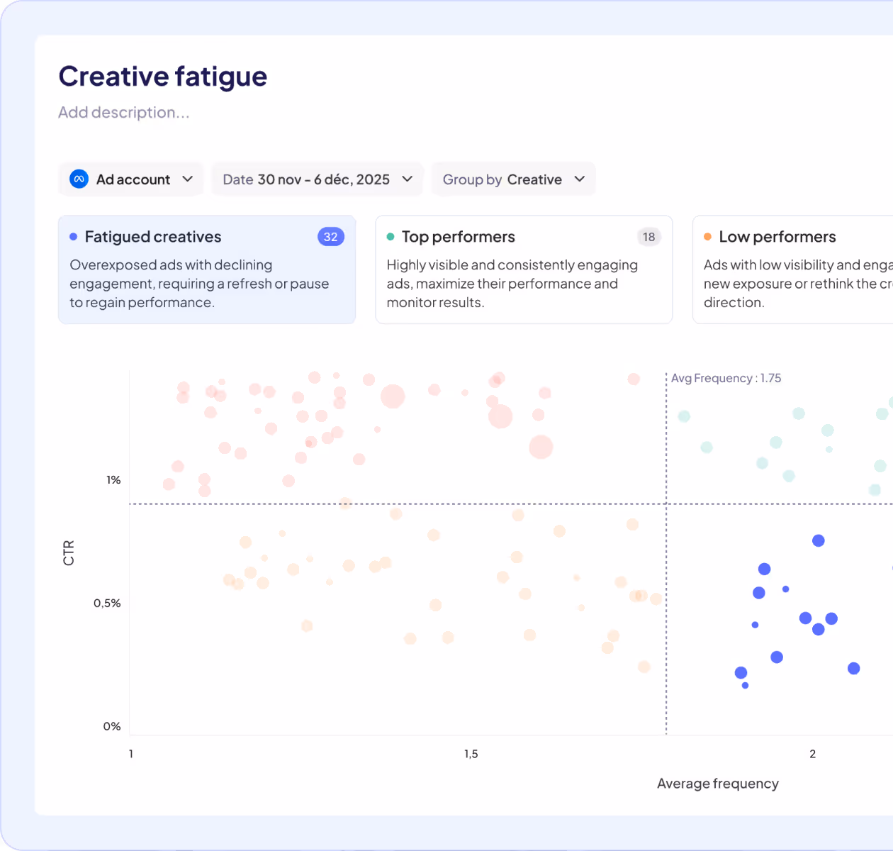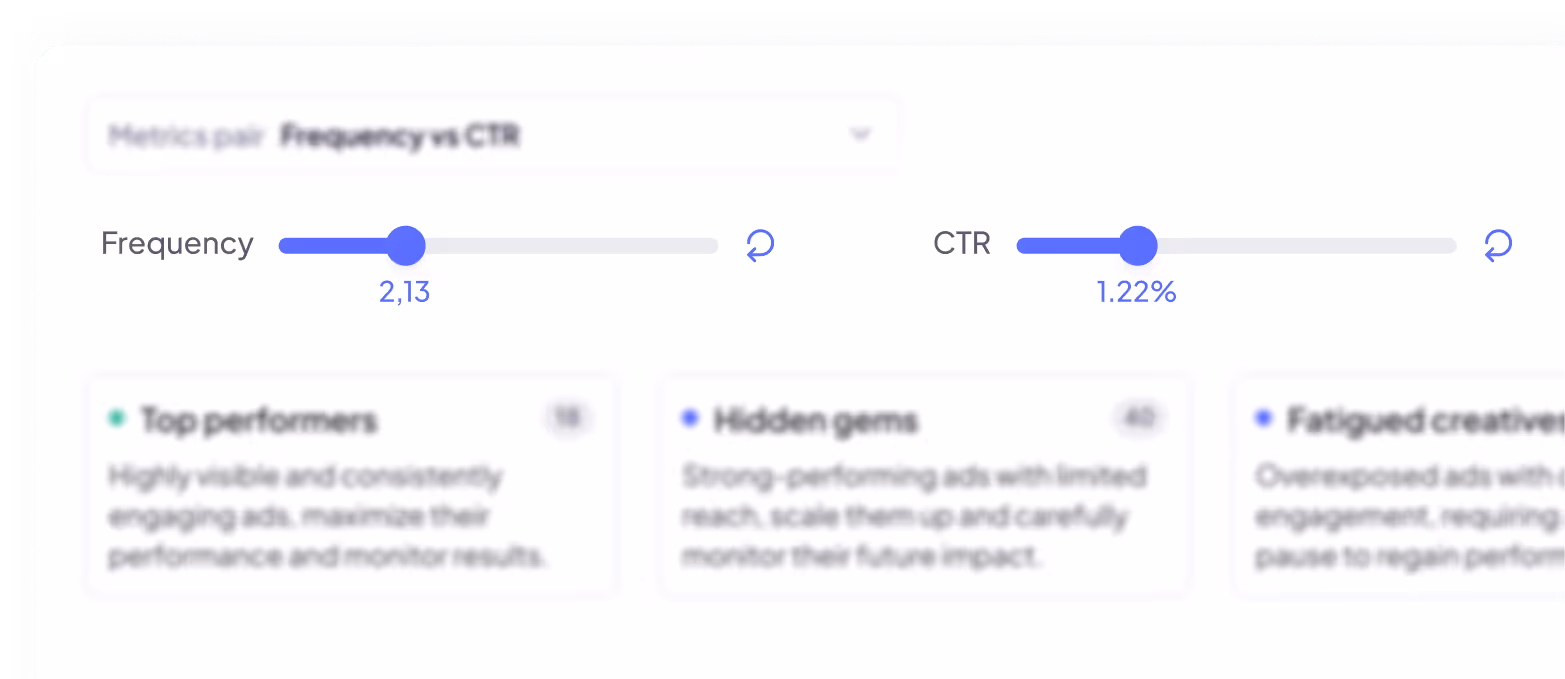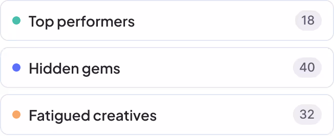 Stay ahead of declining results — our Creative Fatigue report spots ads that are starting to slow down, so you can react fast and keep your campaigns performing.