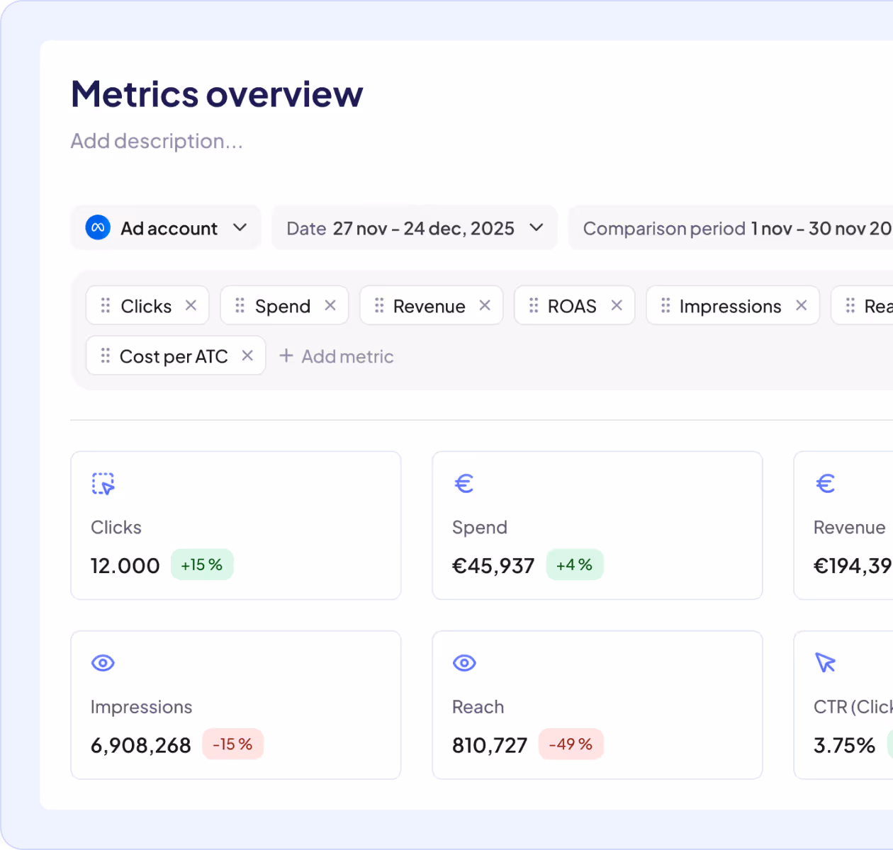 Metrics Overview centralizes every key performance indicator from your ad accounts, giving you a single, clean view to monitor spend, efficiency, and engagement — without switching between platforms.