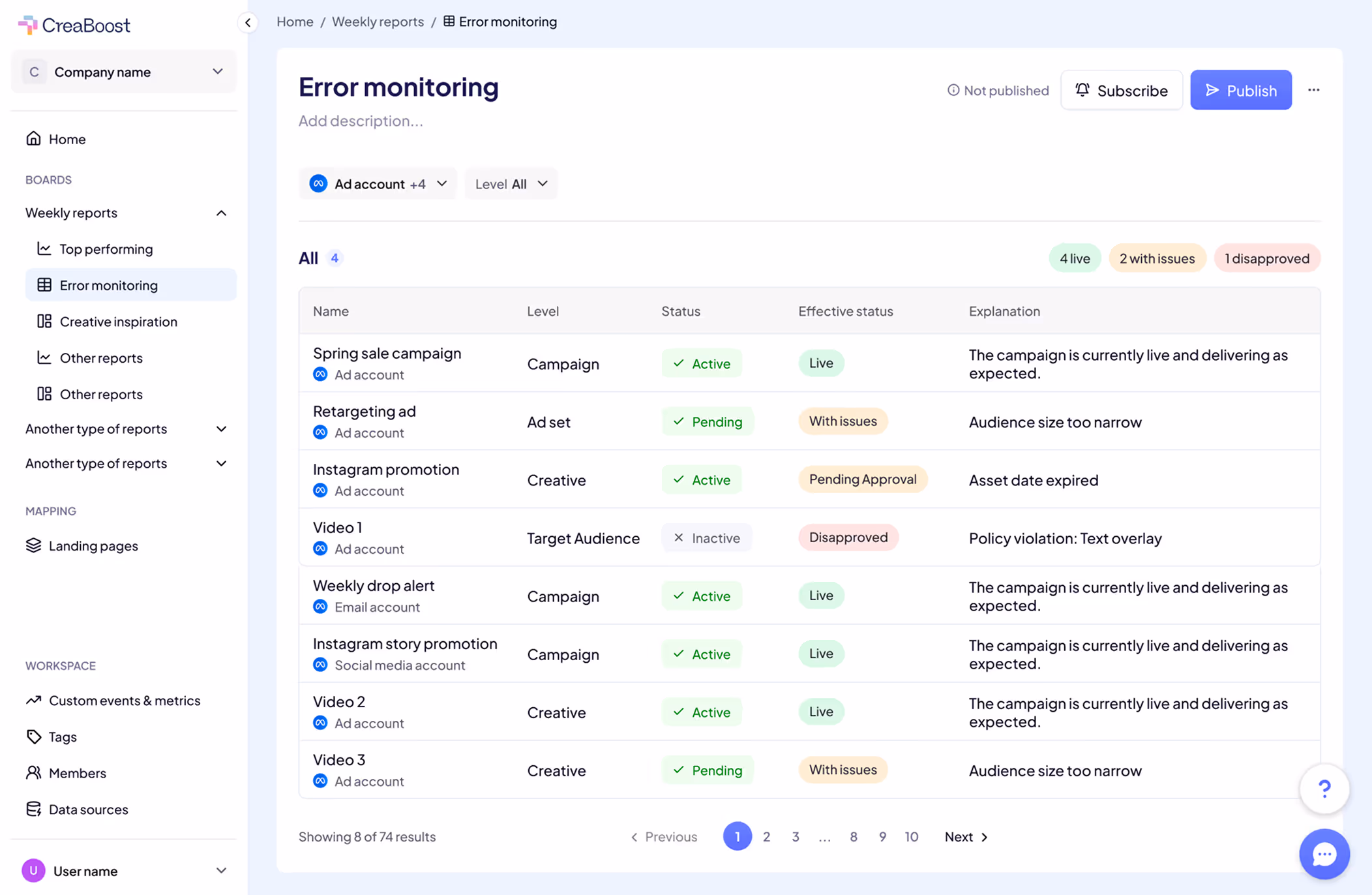 Manage multiple ad accounts and platforms from a single workspace. Forget switching tabs — all your data, creatives, and metrics live together in Creaboost.